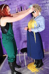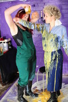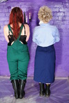 Best friends Scarlet and Morgana are dressed for work, Scarlet in smart dark blue knee length skirt, pale blue blouse, and sturdy work boots, while Morgana wears green dungarees tucked into black wellies, with a swimsuit under her overalls, and they both have matching tied stockings as hair decoration. And they're going to make a total mess of each other!