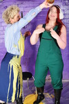 Lady Rose finds Evelyne the Cook in the dungeon, preparing some wearing food for an upcomming event. Evelyne is wearing the brand new urban combat trousers she's been looking forward to receiving. So of course Rose decides Evelyne's outfit must be mess tested. Which means her own short dungarees, spandex leggings, and blue check shirt are going to suffer too.