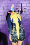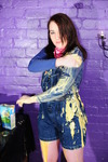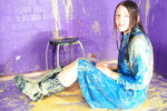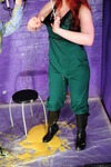She thoroughly fills the shortalls, pouring custartd and syrup into them, both down the inside and filling her pockets, and then once she's nice and soggy, she completely covers the outside of her outfit too. Her bare legs and boots don't escape the treatment, and once she's sitting in the pool of mess on the floor she pours syrup and custard all over her hair and head too, ending up completely drenched in mess from head to foot.