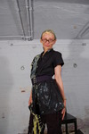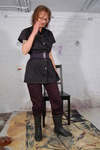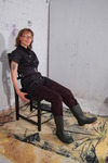Aha, the lovely Maude, today dressed in very shiny black satin trousers, black sleeveless dance leotard, and very sexy heeled leather boots, having a lot of fun with savoury clothes filling.