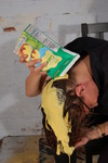 Finally, she covers her hair, shoulders, and still-clean back in yellow mess. Satisfied that the dress is indeed suitable for wearing in a barrel of beer, she sits back and relaxes in the custard.