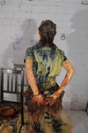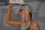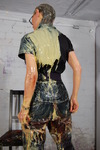 Eventually she gets hosed down, still in the boilersuit and boots. Once the worst of the mess has been washed off it, she takes the boilersuit off to reveal the dance leotard she's wearing underneath. She then fills and covers the leotard with yet more soup, front and back, before being hosed down again, in just boots and leotard this time.