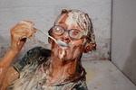 She gives herself a chocolate gateaux facial, and later on adds syrup to the custard in her hair.