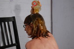 Once her outfit has been entirely reduced to messy ruin, she sets about her hair, a full syrup shampoo is among her pleasures, followed by a full custard facial, including custard flowing inside her glasses.