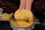 First, she pours four litres of custard onto the floor, making a nice gooey pool, she then slide-steps into the pool, coating the lower hem, and then bends down and ensures the lower few inches of the skirt are thoroughly coated inside and out.