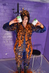 Lady Jasmine starts slowly, first she takes her shoes off, fills them, and slips them back onto her feet. Then a little gunge into each pocket, though she manages to miss with the right hand one and gets a lovely thick streak of yellow all down the front of the costume before emptying a couple of cartons down the inside, from where the thick yellow liquid soon flows out onto her tights and down her shapely legs. While gunge is still dripping from inside, she subjects the suit to an alternative take on her favourite 'sitting in a tray of goo' approach, sitting reverse-astride the chair-back as she lowers her still-clean bottom into the full tray of custard.