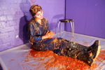 To finish off, Chastity sinks to the gunge-coated floor and plays in the pool of spilled mess.