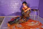 She starts with soup poured into the front of her suit, quickly followed by more down the back - watch her wiggle as it drenches her bottom! Mour soup and then beans are added, and eventually tomato juice too, until her outfit and hair have been reduced to a savoury-drenched mess. In which she plays, rolling on the floor, draggiung her already messy hair through the pool of beans and soup, and scooping up great handfulls of mess to pour over her already-soaked outfit.