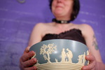 Next she sits cross-legged on the floor, and using the blue jasperware custard tureen, which has been filled with custard, she scoops out handfuls and gives herself a thorough custard shampoo.