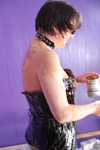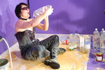 Needless to say we were happy to oblige her! Wearing one of her own short dresses, with fishnet tights and huge Goth boots, she entered the dungeon knowing that Willomina was going to totally give her the treatment, just as she'd requested. She also gets to mix up the first bucket of the gunge she is going to receive, which she rather enjoys doing.