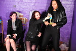 Lucia, wearing black PVC jeans, a shiny black top, black zip-front top over it, and calf-high patent leather boots, over a black bra and panties set.To start with, they all strip down to their underwear. Then, in pairs, taking turns, they play Scissors-Paper-Stone, and the loser of each round has to choose whether she is going to put some clothes on, or have some custard in what she's already wearing.