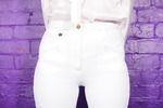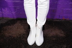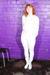 Maude wears: White jeans, high neck white satin blouse, and lilac lace-up plimsolls.