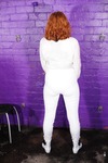 Miss Abigail wears stunning white jodhpurs, a white silky blouse with a tie front and keyhole back neckline, white socks, and little white booties. Beneath her white clothes she wears black panties and a black bra top.